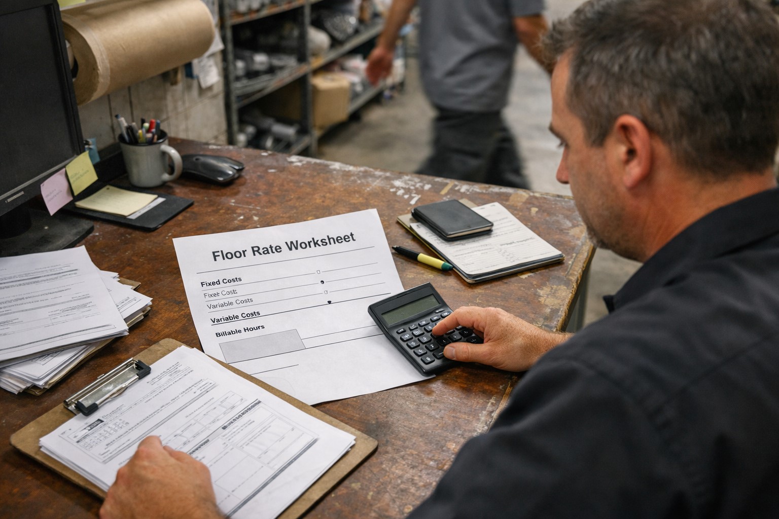 To find your true floor, start with fixed monthly costs: rent or mortgage, utilities, insurance, equipment payments, software, and administrative payroll. Add variable costs at your average monthly volume, including materials, supplies, and sublets. Then divide that total by the realistic number of billable hours you produce per month, not the theoretical maximum. The result is your break-even overhead rate per hour, before technician pay and profit are even considered.